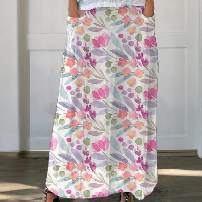 Watercolor Spring Garden Floral Repeat Pattern Printed Women's Linen Pocket Skirt