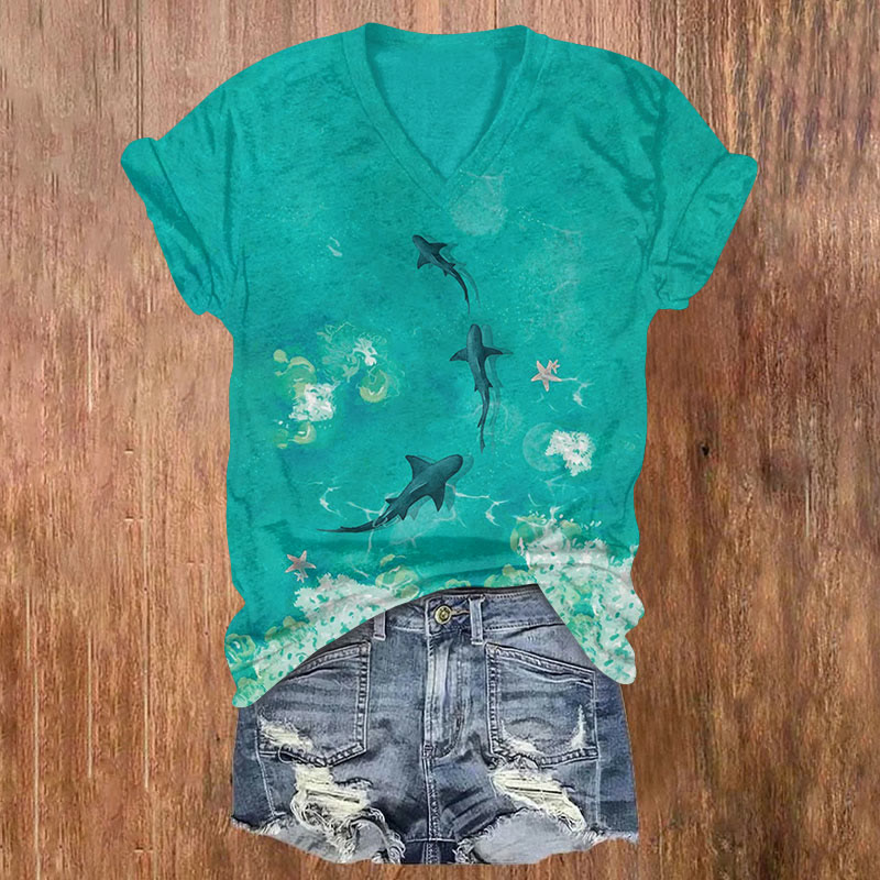 Crystal Clear Ocean Starfish Print V-neck T-shirt
