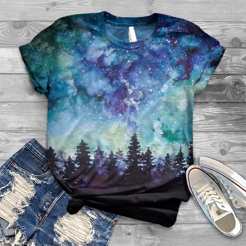 Forest Watercolor Under Northern Lights Print T-shirt