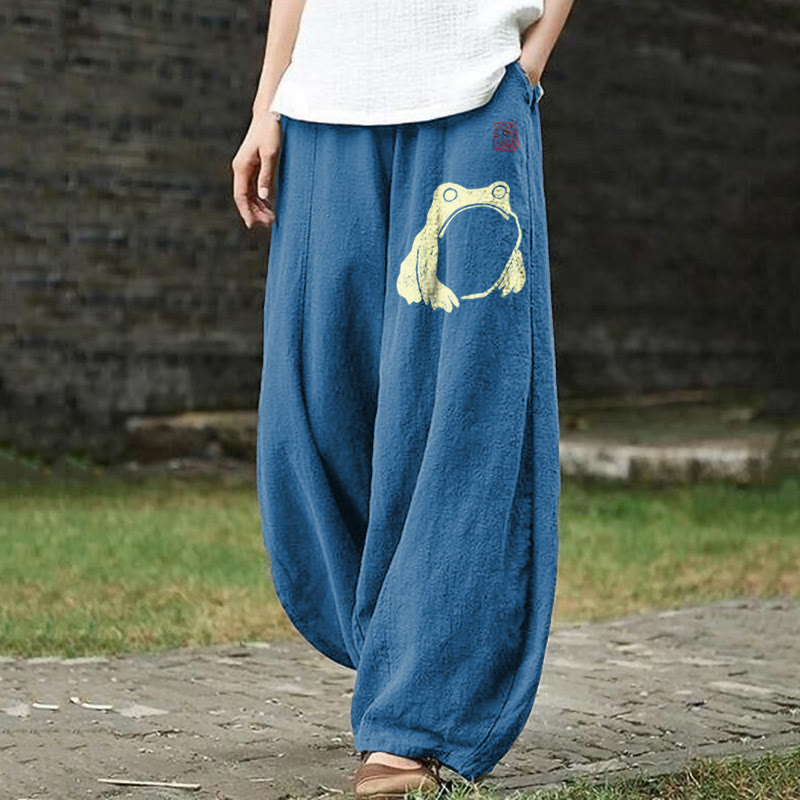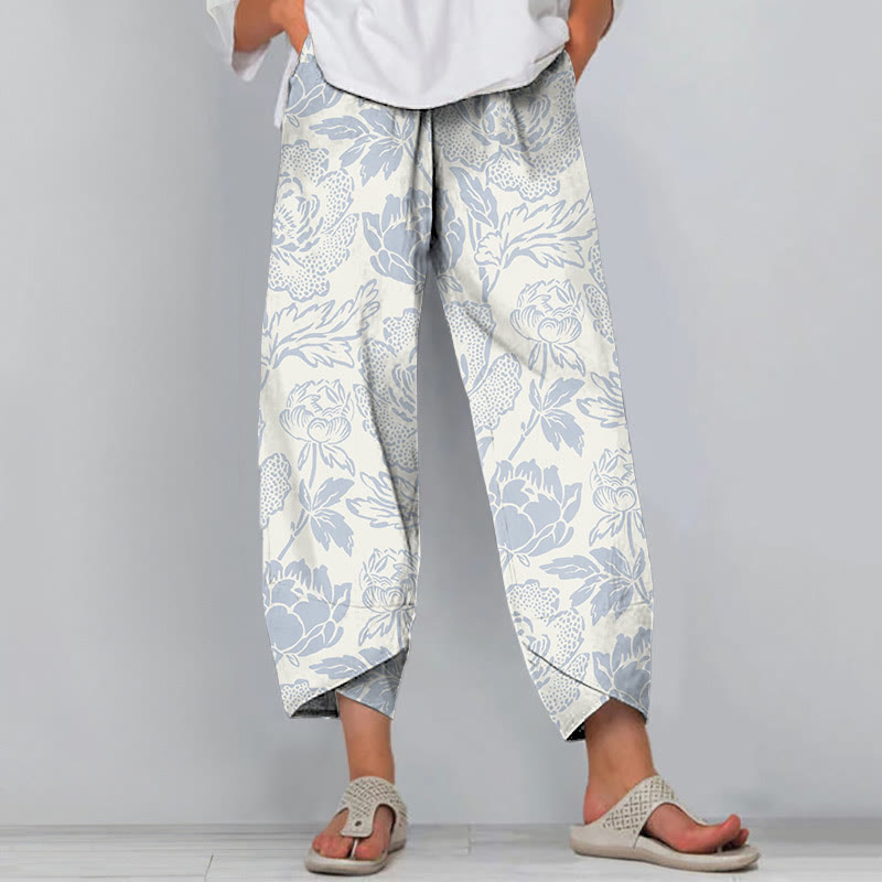 Japanese Vintage Floral Art Print Drawstring Pocket Women's Pants
