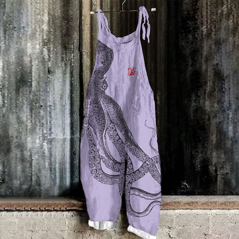 Japanese Art Octopus And Crab Print Art Loose Casual Jumpsuit