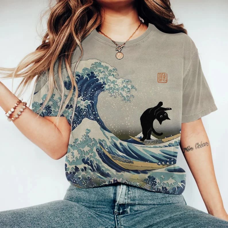 Japanese Art Cat Backflip Waves Print Round Neck T-shirt