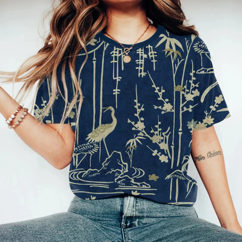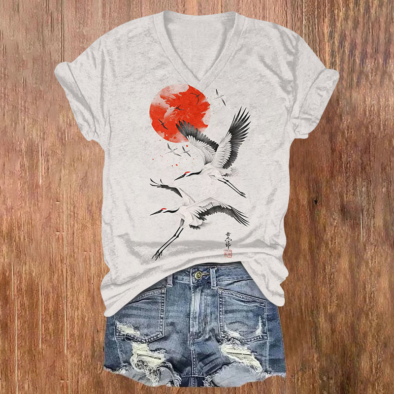 Japanese Vintage Flying Cranes Print V-neck Short-sleeved T-shirt