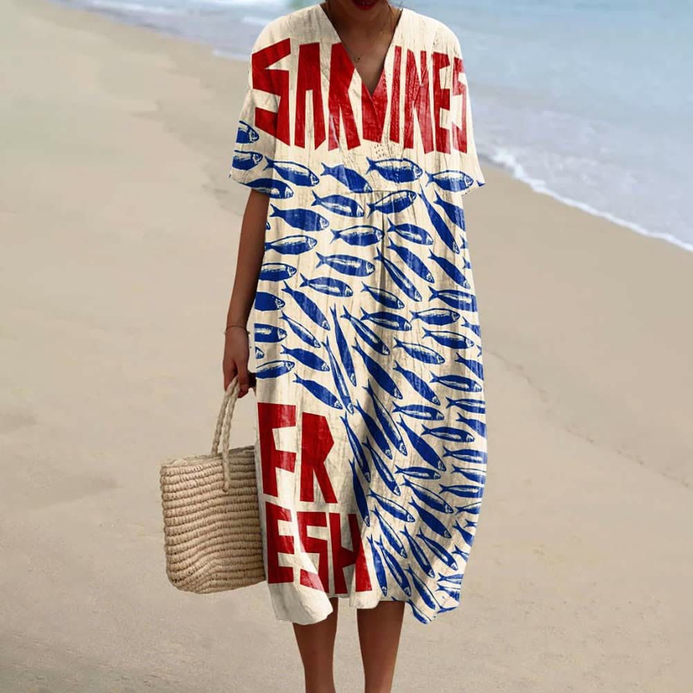 Women's Casual Fresh Sardines Art Print Short-sleeved Midi Dress
