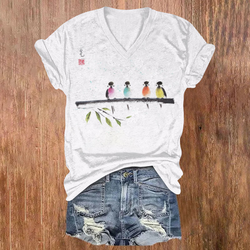 Japanese Retro Colourful Family Bird Print V-neck Causal T-shirt