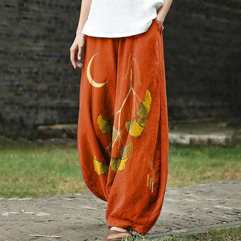 Vintage Japanese Ginkgo Leaves And Moon Art Print Casual Pants