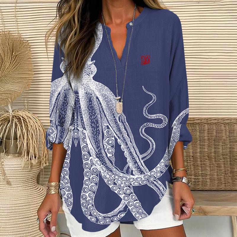 Japanese Art Octopus Graphic Print Casual V-neck Blouse