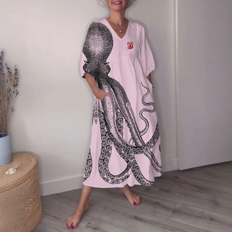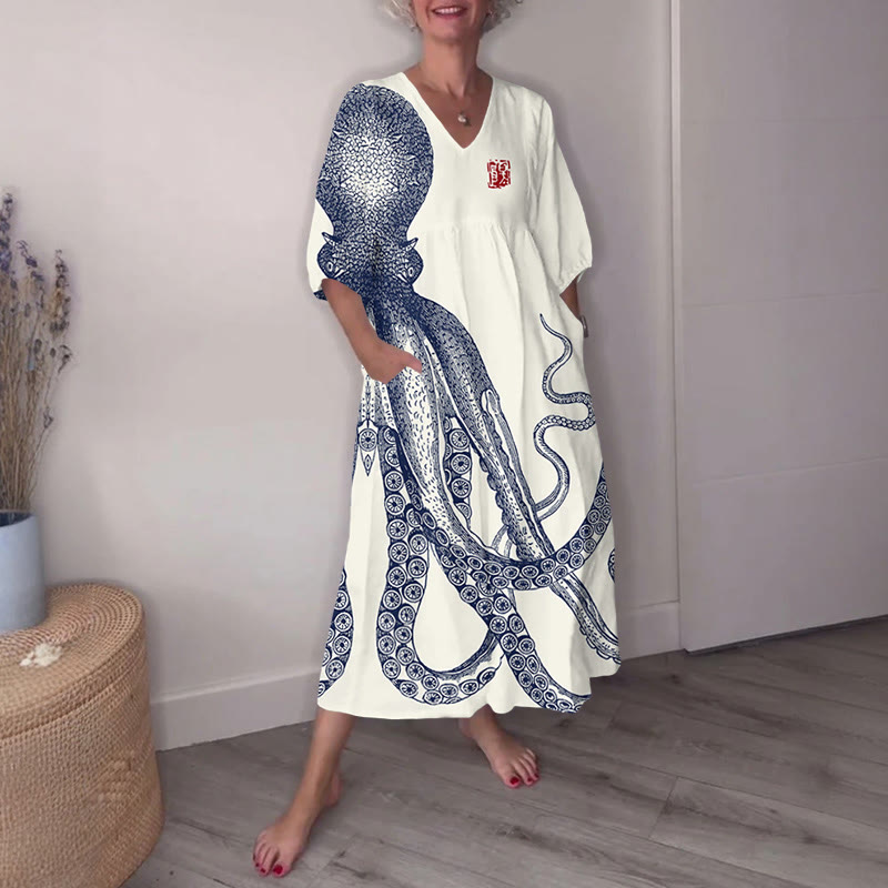 Japanese Art Octopus And Crab Print Casual V-neck Dress