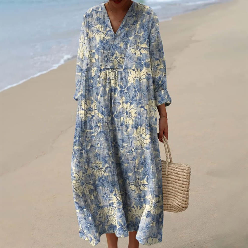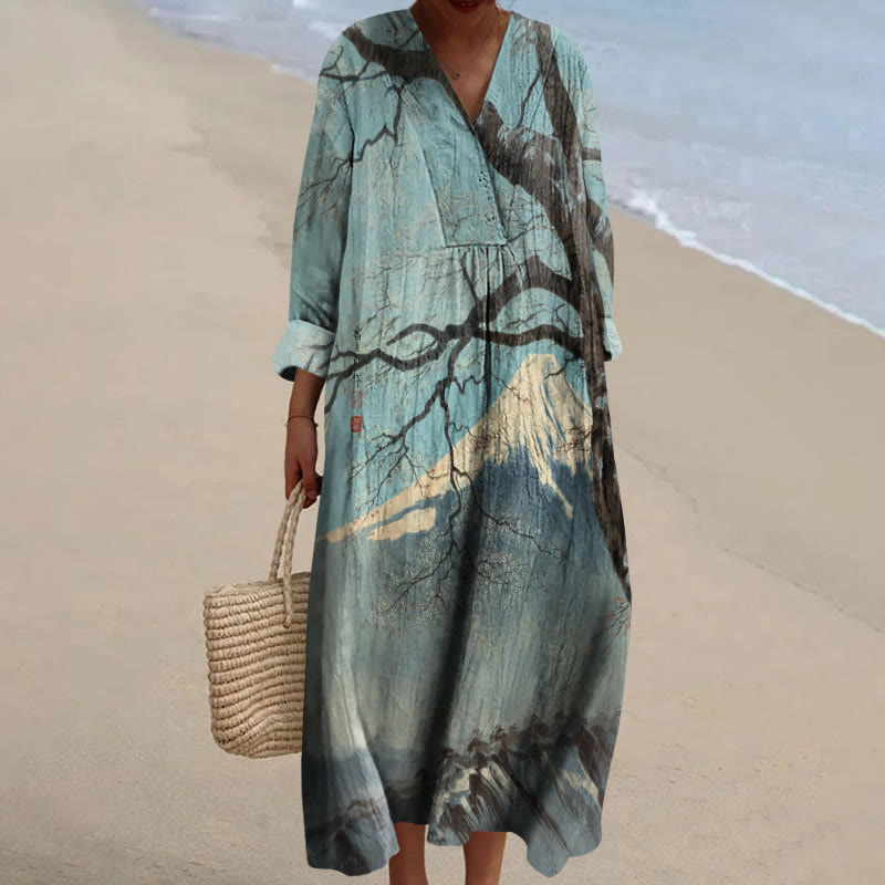 Women's Japanese Mountains And Flowers Print V-neck Long Sleeved Casual Midi Dress