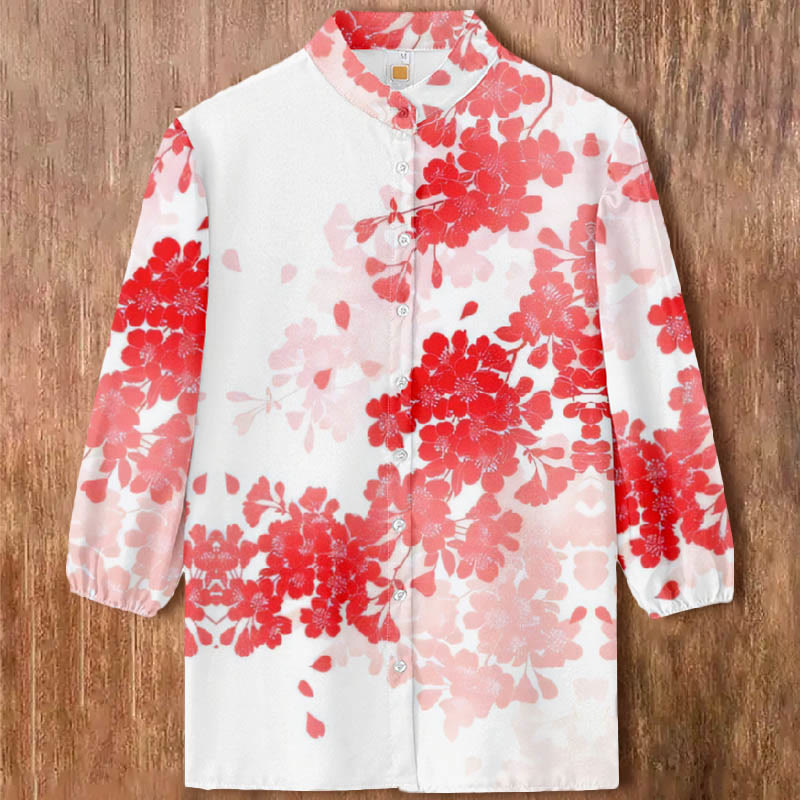 Women's Vintage Watercolor Red Sakura Print Casual 3/4 Sleeve Blouse