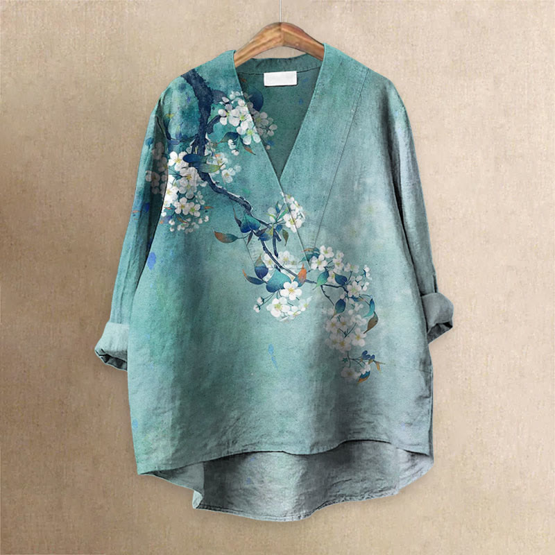 Japanese Antique Pear Blossom Ink Painting Printed Casual V-neck Blouse