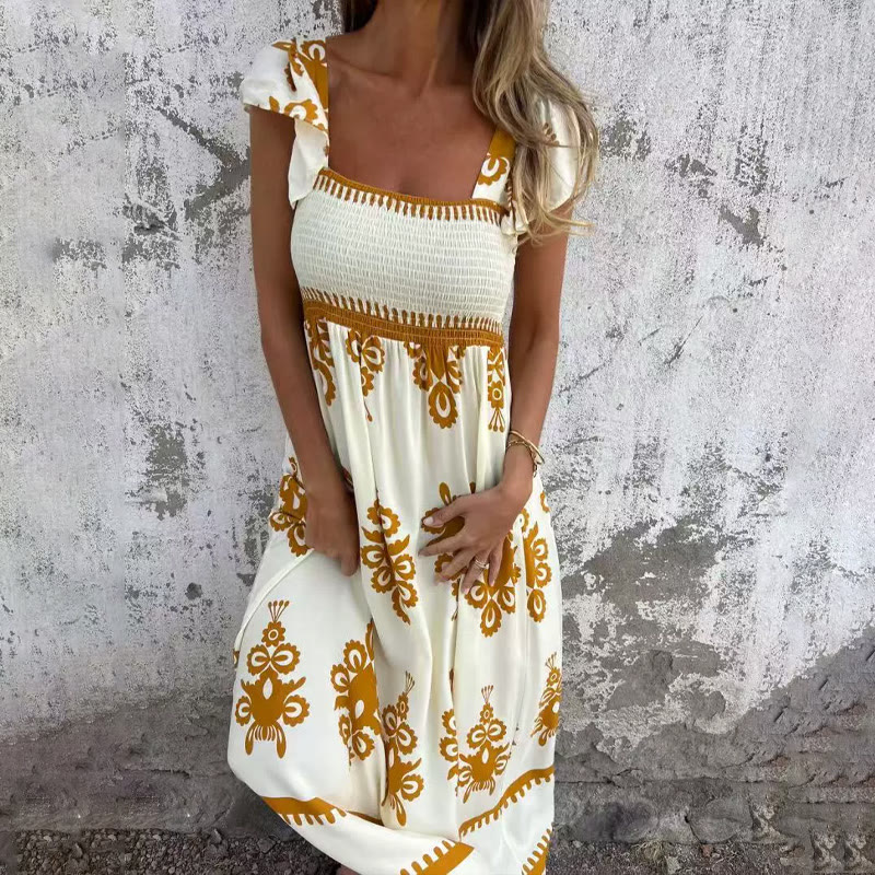 Boho Beach Ethnic Print Ruffled Strappy Maxi Dress