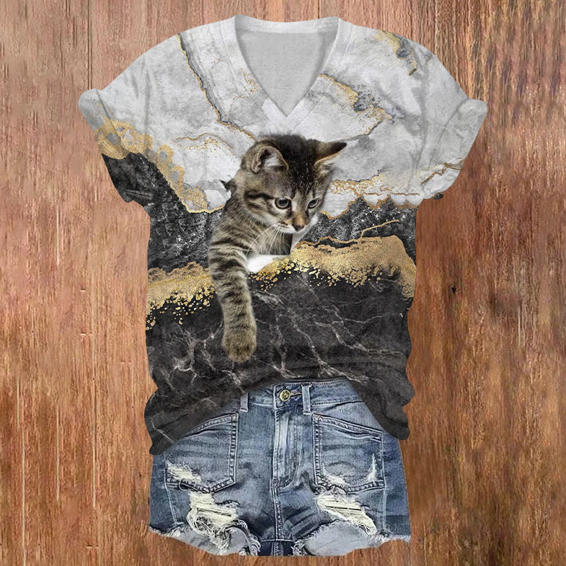 Cat Breakthrough Stone Pattern Print T-shirt