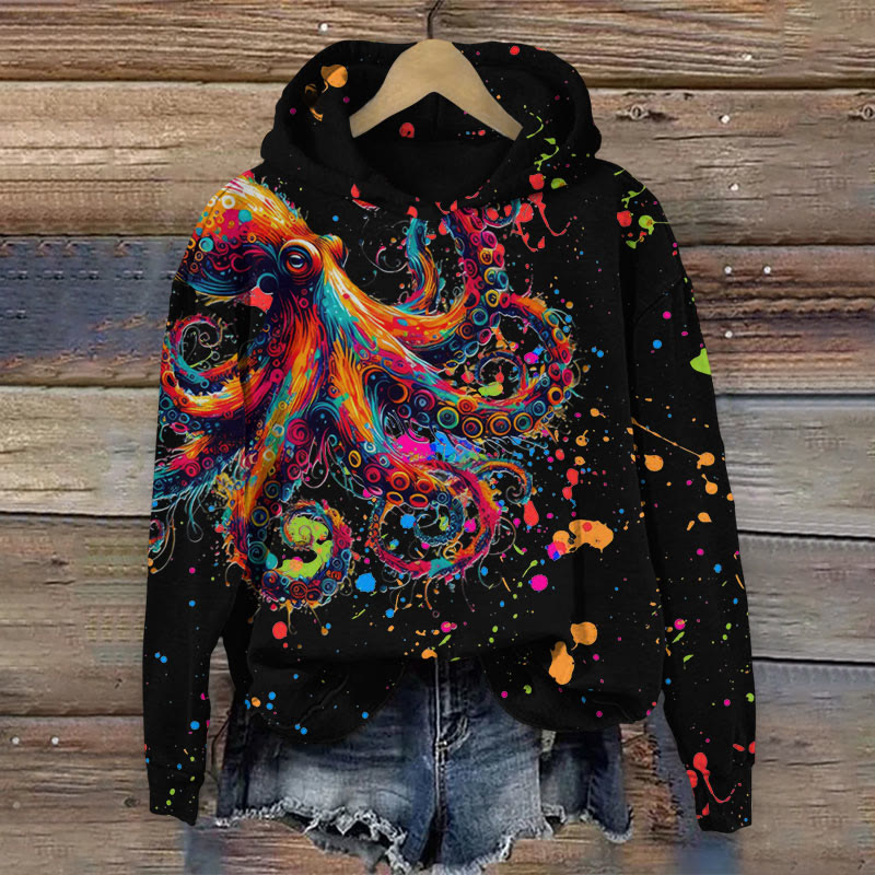 Colorful Splashy Octopus Print Long Sleeve Hoodie