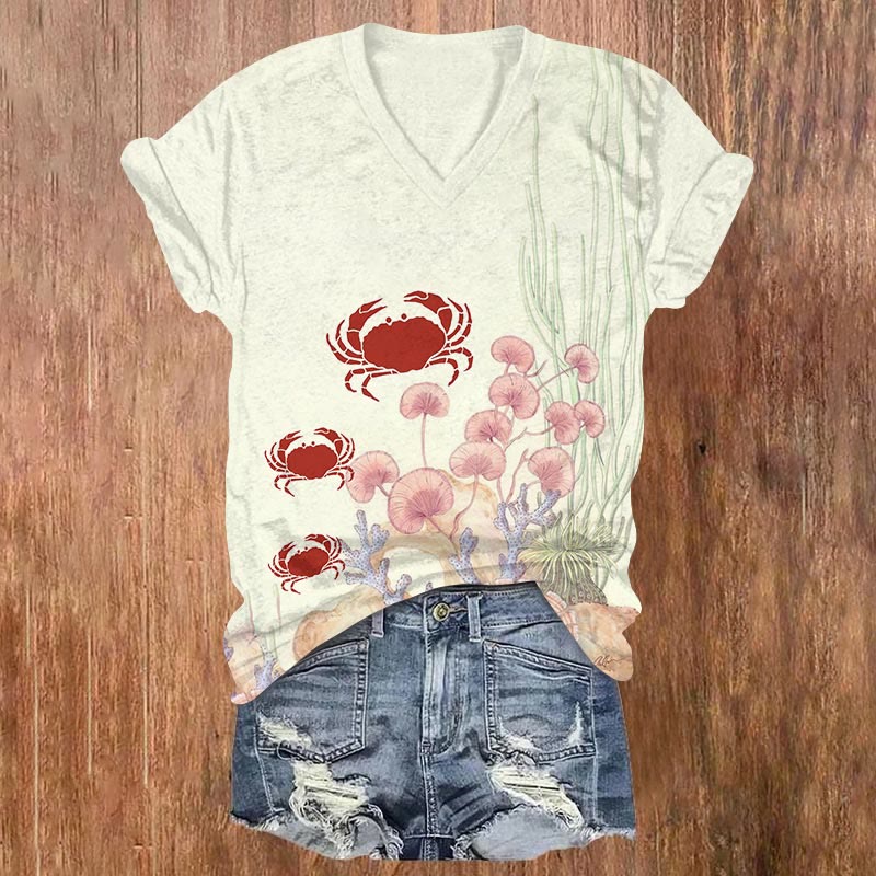 Creative Coral & Red Crab Art Print V-neck T-shirt