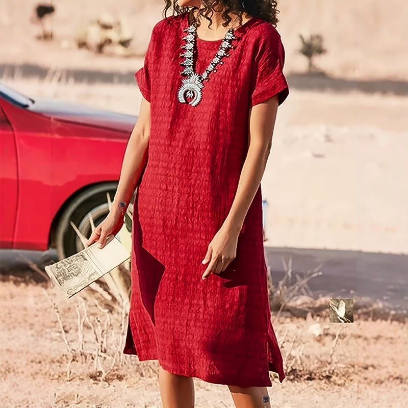 Elegant Solid Wrinkled Texture Round-neck Short-sleeve Slits Dress