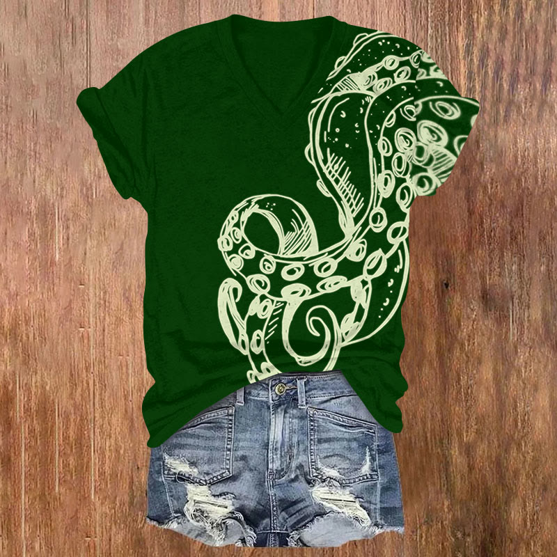 Fluorescent Line Octopus Tentacles Print V-neck T-shirt