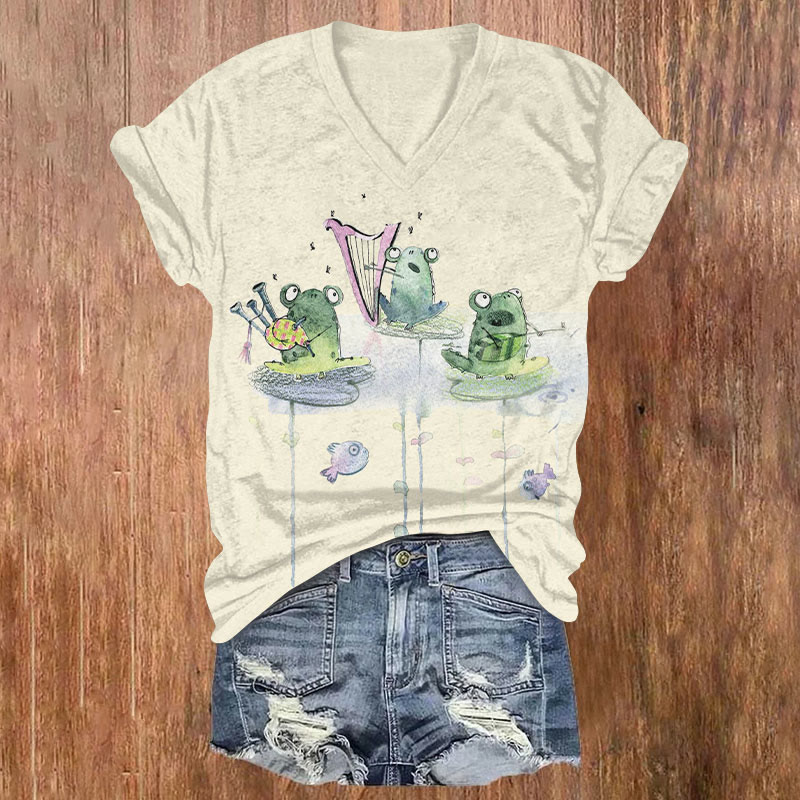 Fun Frogs Playing Musical Instruments Print V-neck T-shirt
