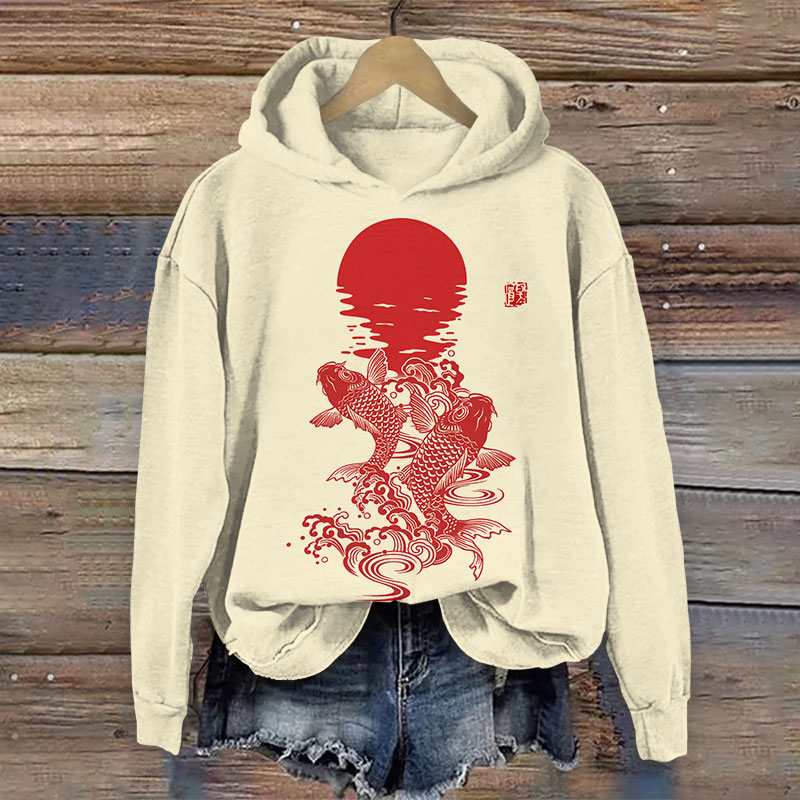 Japanese Creative Koi Carp & Moon Print Long Sleeve Hoodie