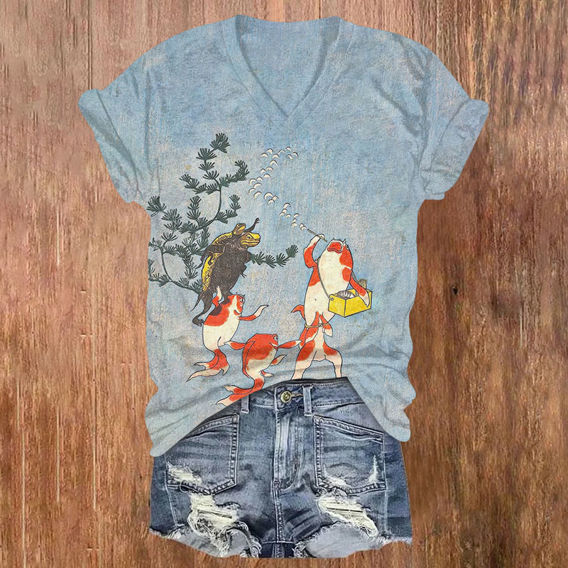 Japanese Gold Fish Making Bubbles Print V-neck T-shirt