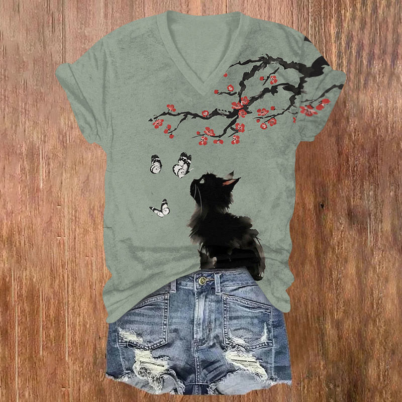 Japanese Ink Painting Plum Blossom Butterfly Black Cat Print V-neck T-shirt
