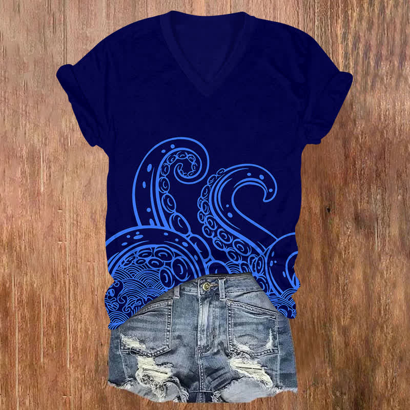 Japanese Solid Octopus Tentacles Art Print V-neck T-shirt - Blue - US32-34(5XL) - image 1