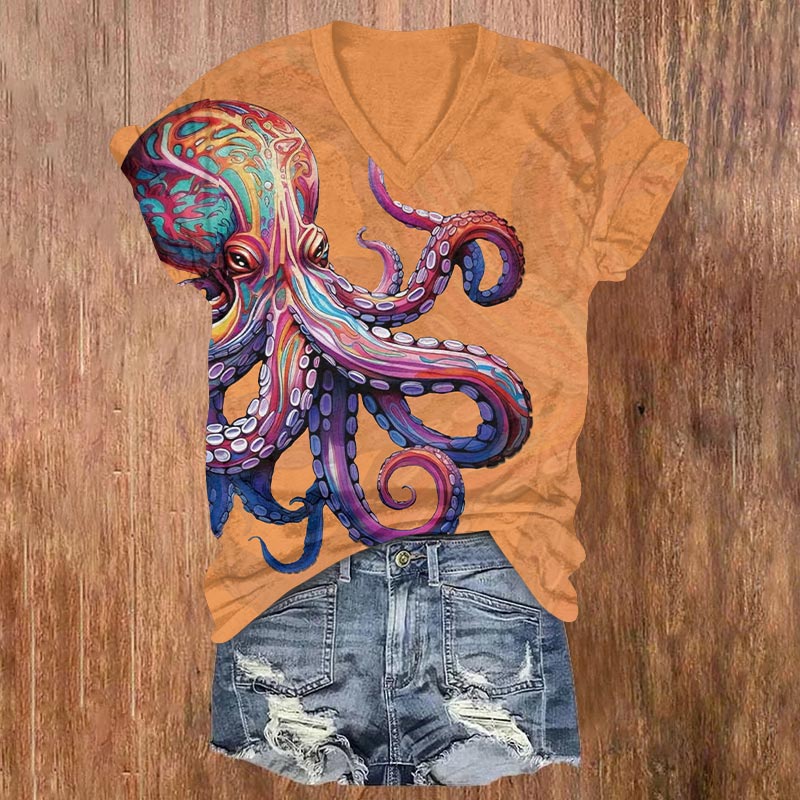 Retro Colorful Striped Octopus Art Print V-neck T-shirt - Orange - US32-34(5XL) - image 5