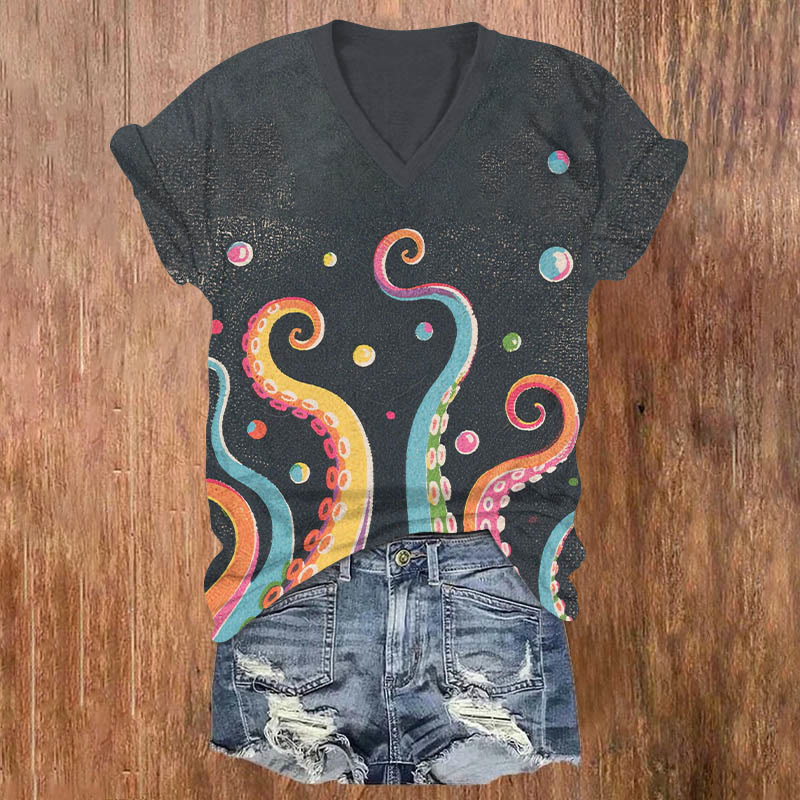 Retro Rainbow Bubble Octopus Tentacles Print V-neck T-shirt