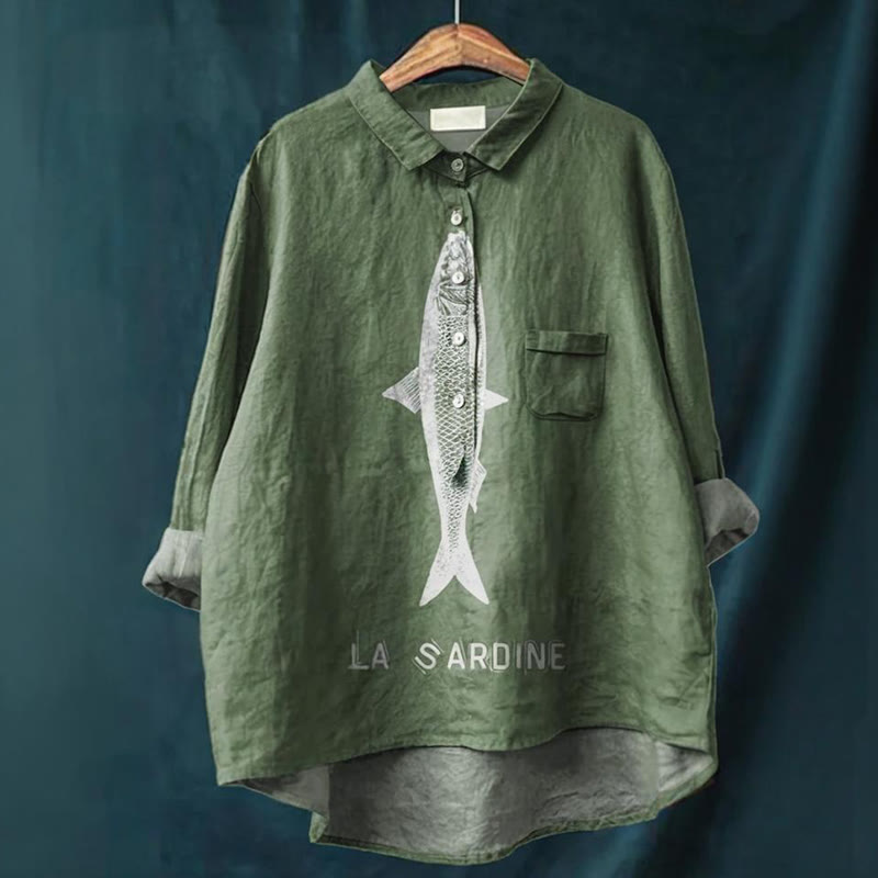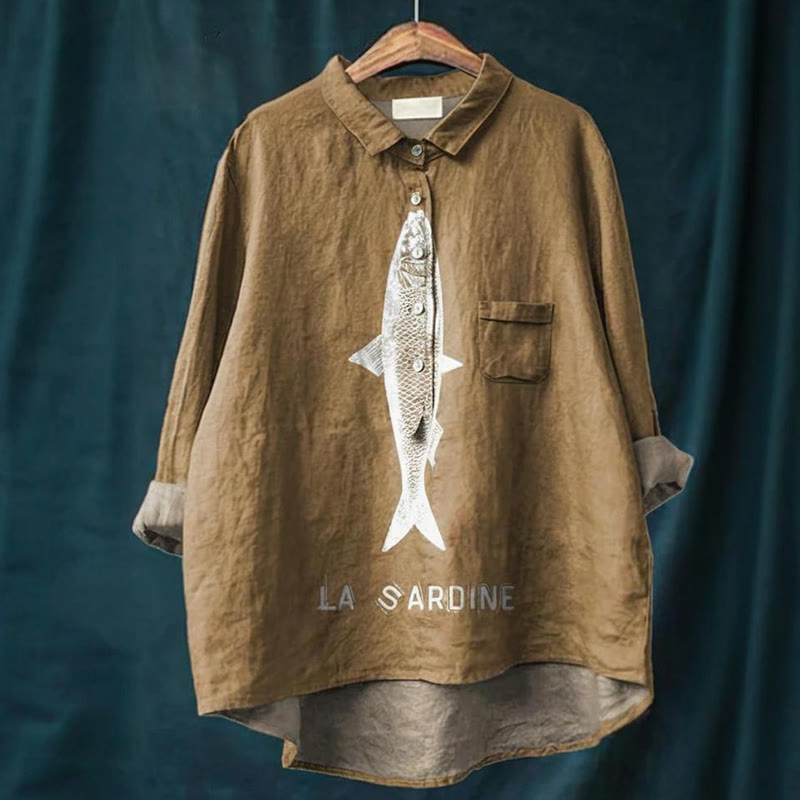 Sardine Fish Graphic Printed Women's Casual Cotton And Linen Shirt