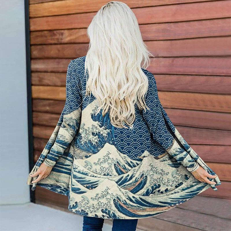 The Great Wave Off Kanagawa Inspired Japanese Art Print Long Sleeve Cardigan