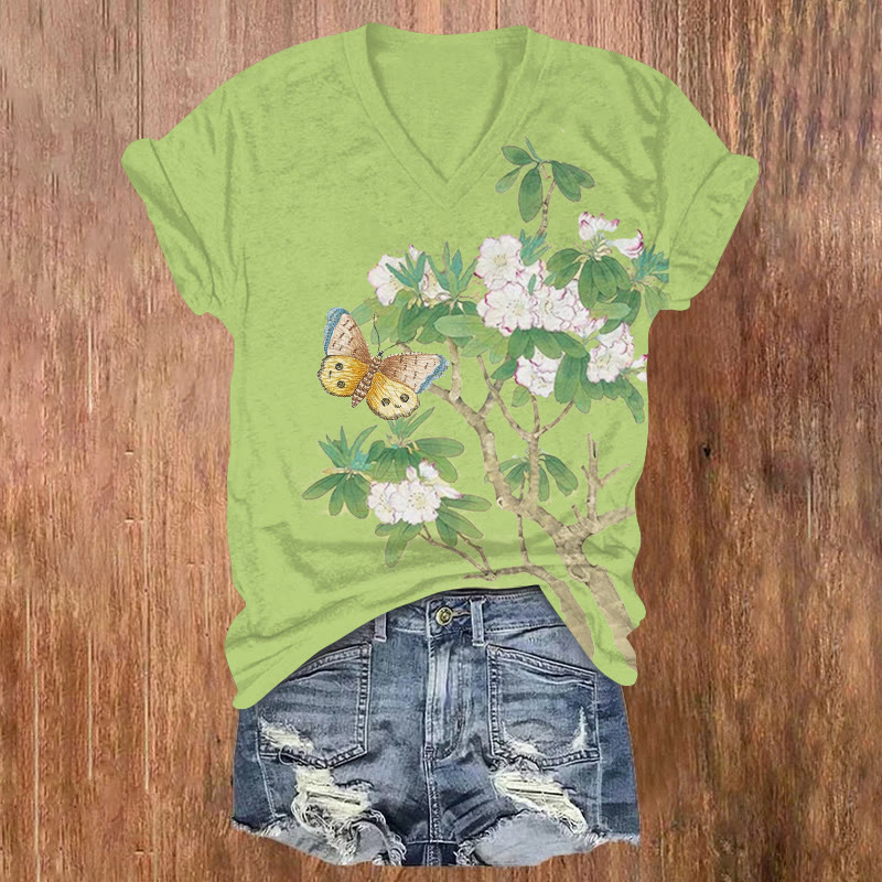 Vintage Floral & Butterfly Art Print V-neck T-shirt