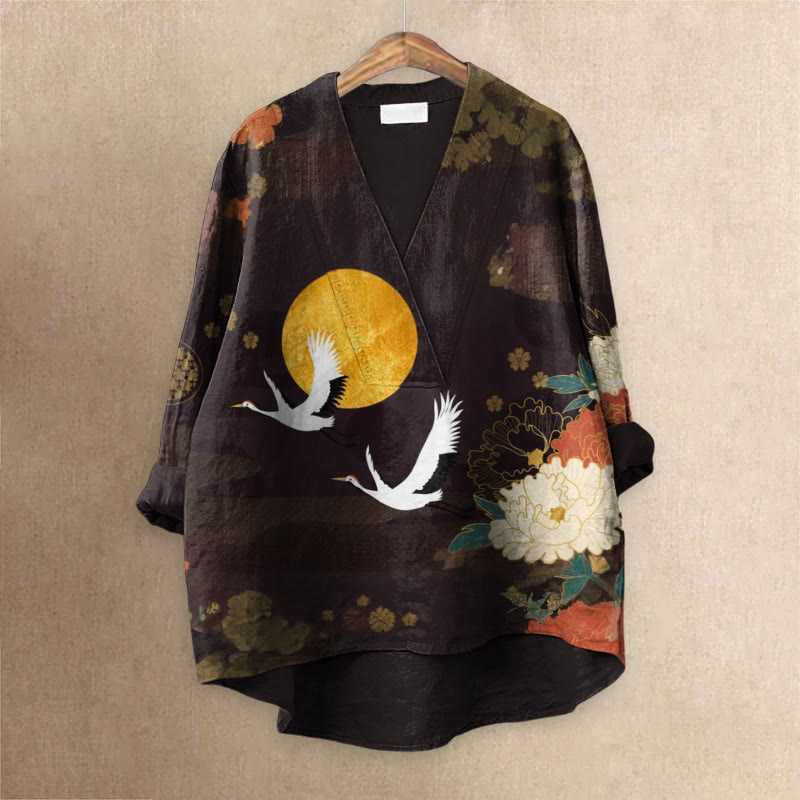 Vintage Japanese Peony Crane Print Casual V-neck Shirt