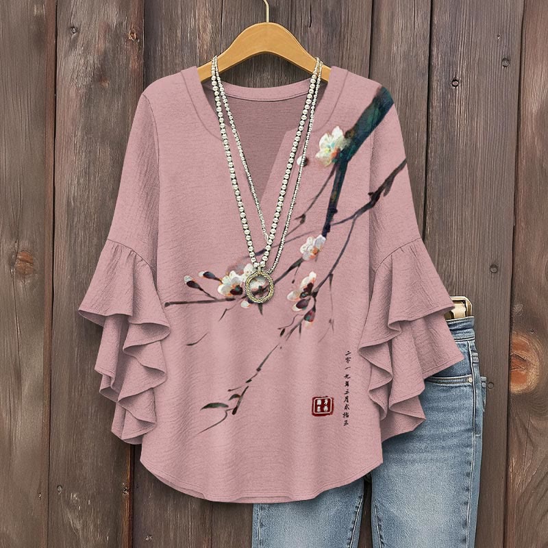 Vintage Plum Blossom Art Print V Neck Half Sleeve Blouse