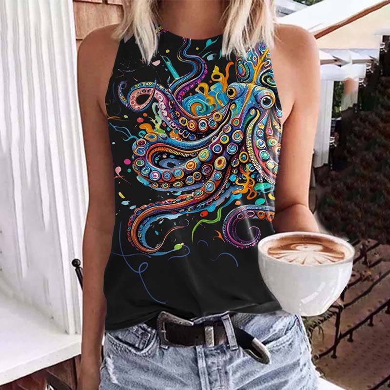 Vintage Rainbow Octopus Art Print Crew Neck Tank Top