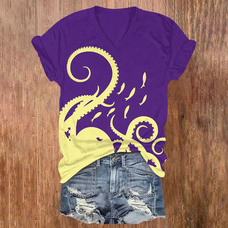 Vintage Simple Octopus Tentacles & Fish Art Print V-neck T-shirt
