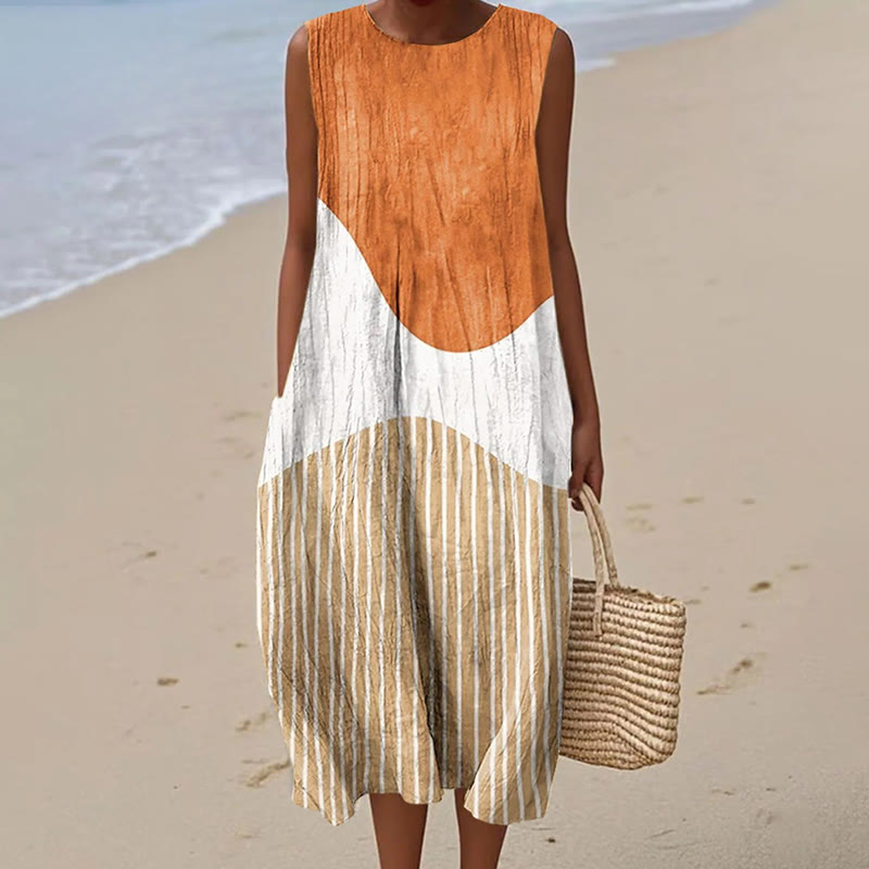 Women's Fashion Color Block Art Print Sleeveless Cotton Pocket Wrap Dress