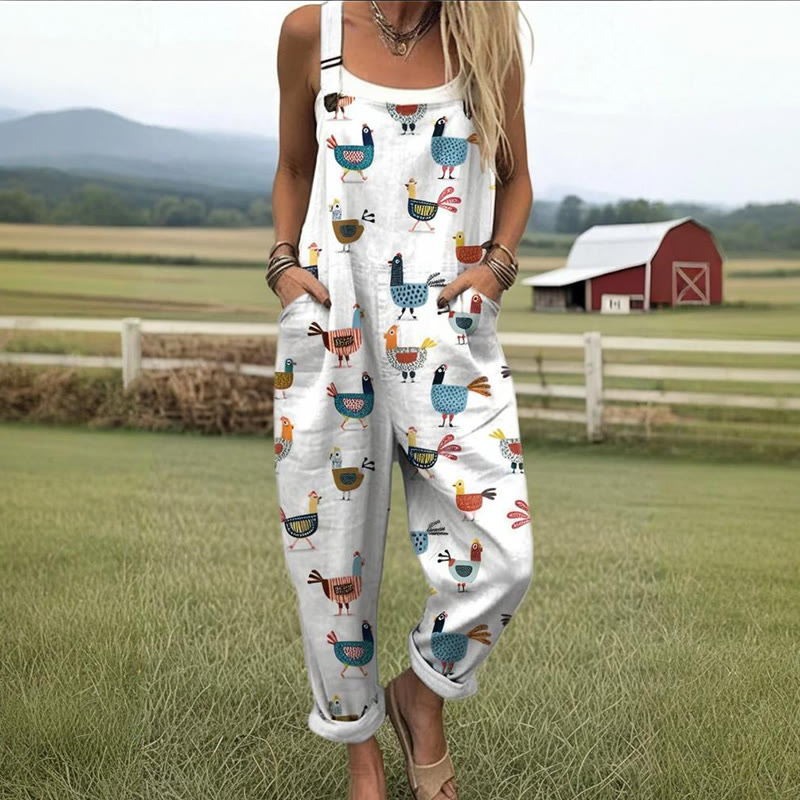 Women's Funny Farm Chicken Pattern Casual Cotton Wide Leg Jumpsuit
