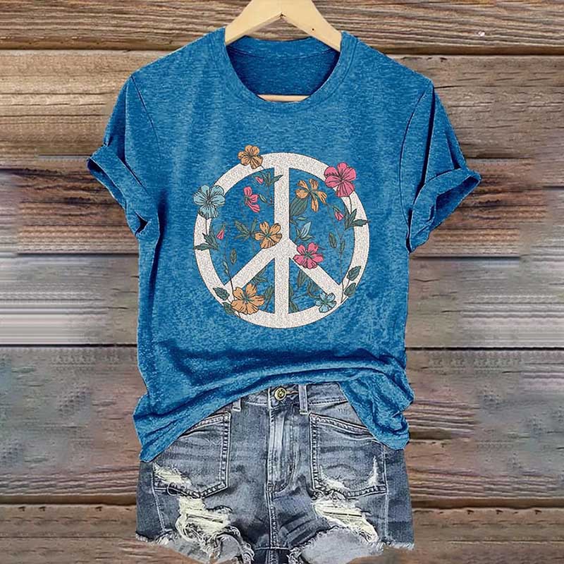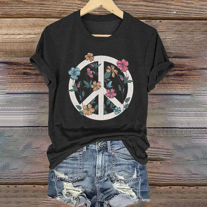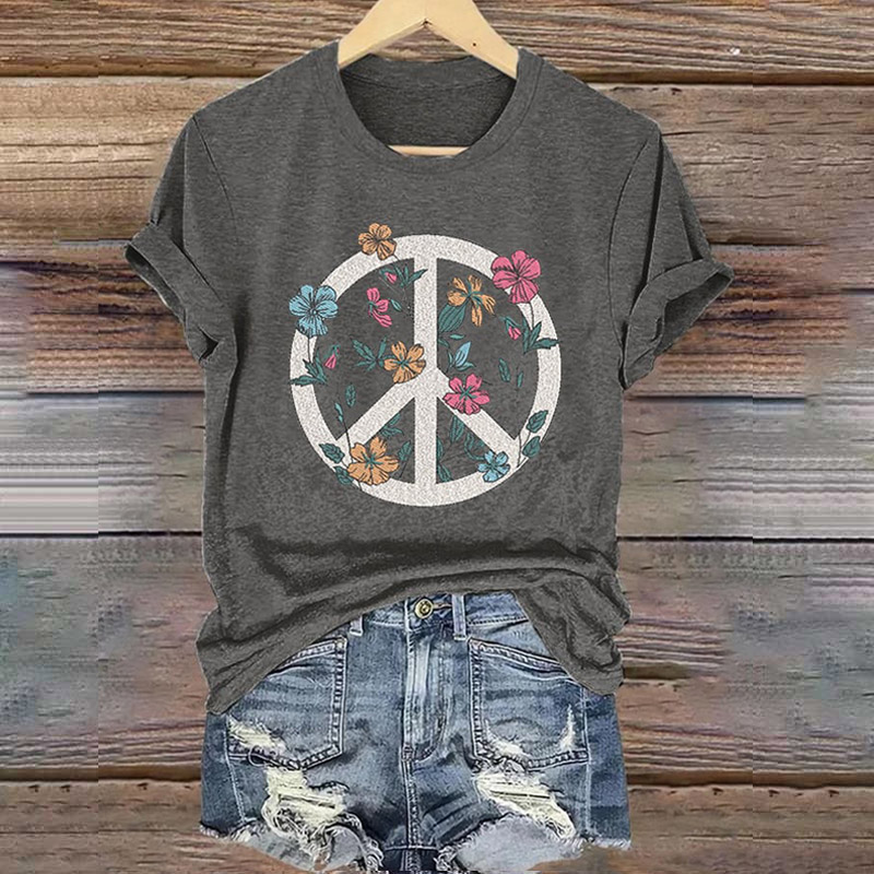 Women's Hippie Peace Sign Flowers Love And Peace Printed Casaul Short Sleeve Crew Neck T-shirt