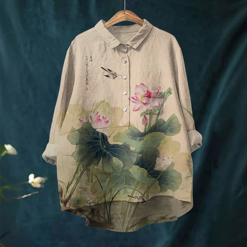 Women's Japanese Vintage Lotus Art Print Casual Lapel Blouse