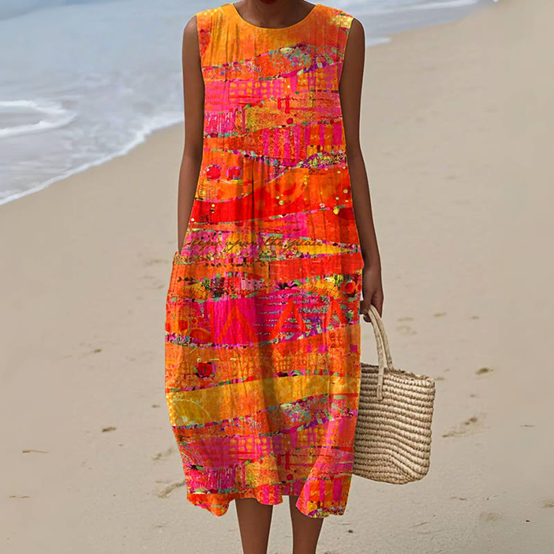Women's Vintage Abstract Geometry Art Print Sleeveless Cotton Pocket Wrap Dress