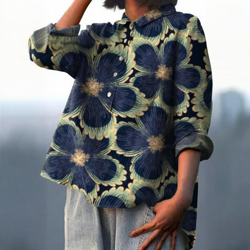 Women's Vintage Floral Art Print Casual Cotton And Linen Shirt