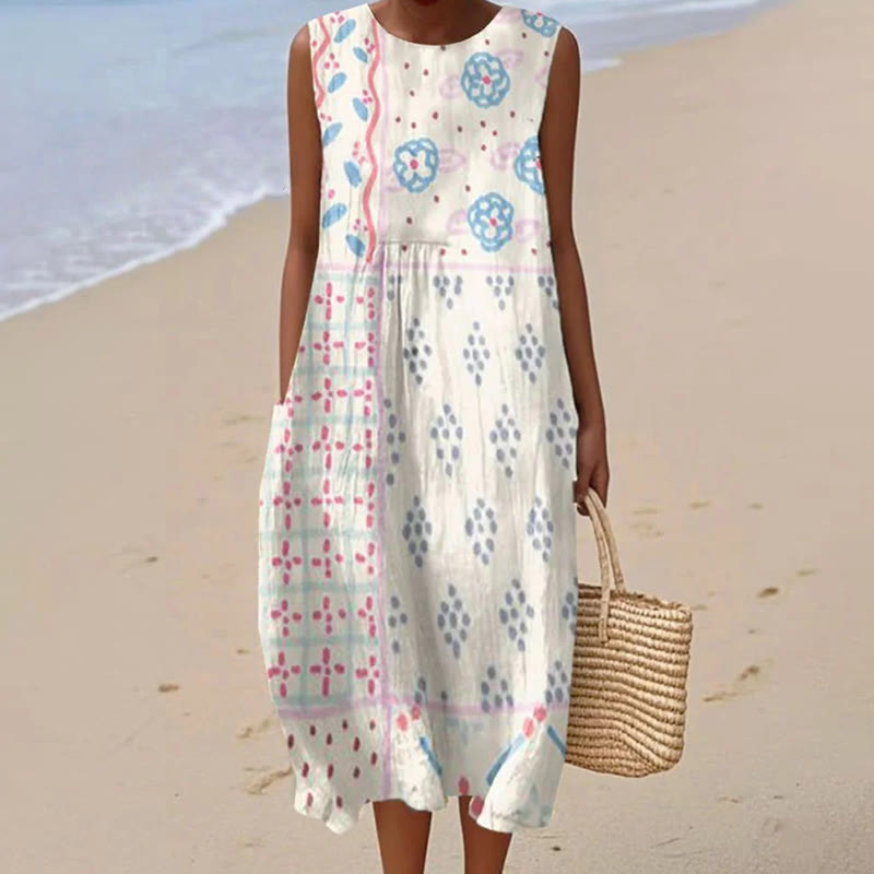 Women's Vintage Floral Art Print Sleeveless Cotton Pocket Wrap Dress