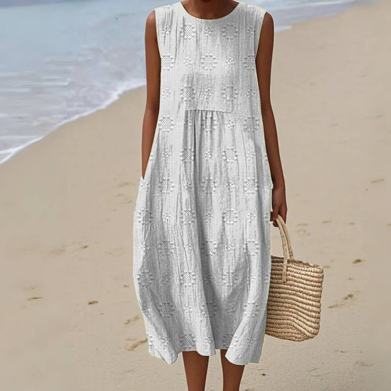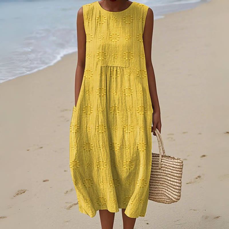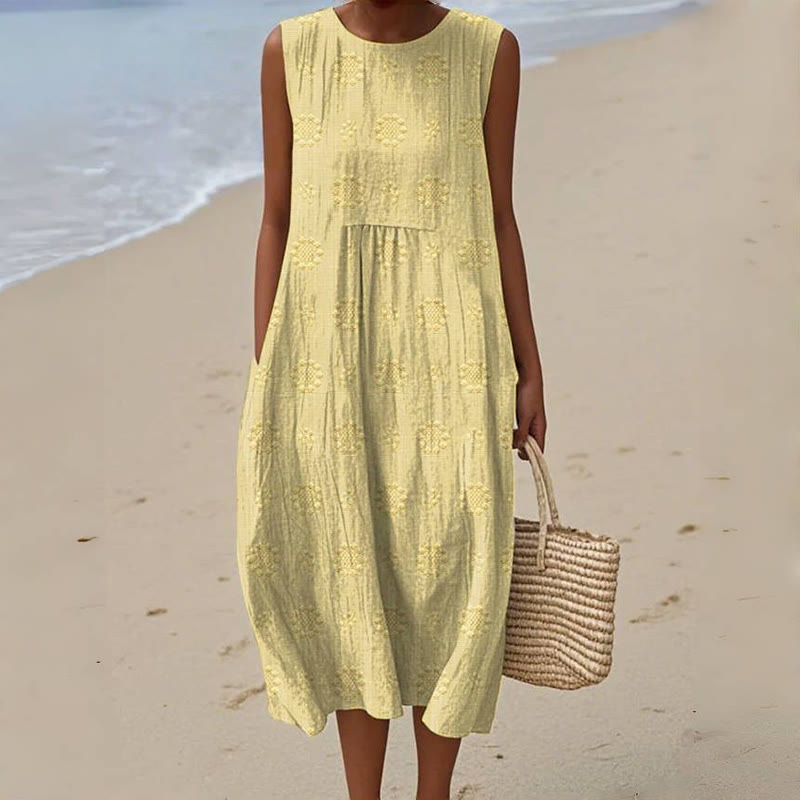 Women's Vintage Floral Pattern Art Print Sleeveless Cotton Pocket Wrap Dress