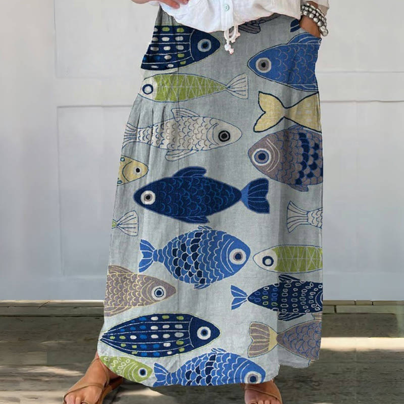 Women's Vintage Lovely Fish Art Print Linen Pocket Skirt