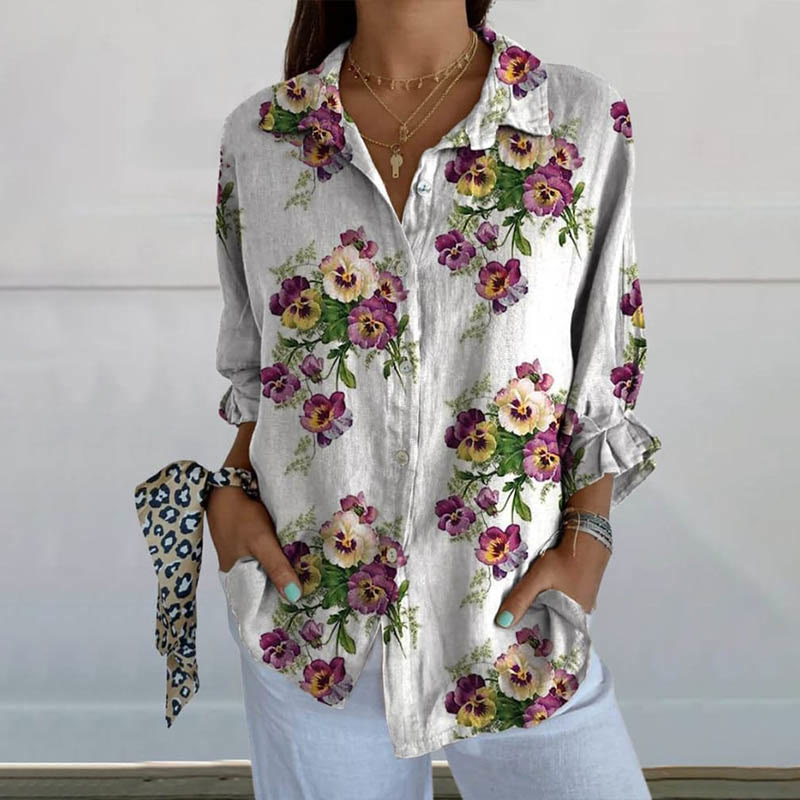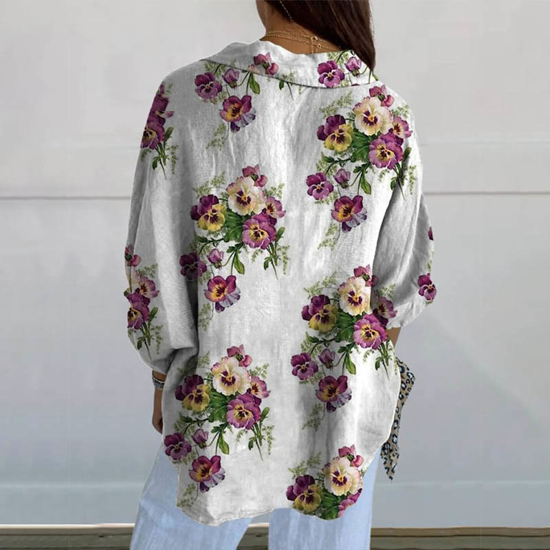 Women's Vintage Lovely Pansies Art Print Lapel Long Sleeve Blouse