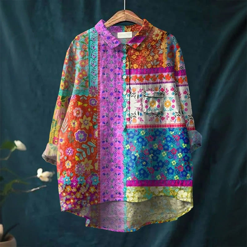 Women's Vintage Patchwork Floral Print Casual Lapel Loose Blouse