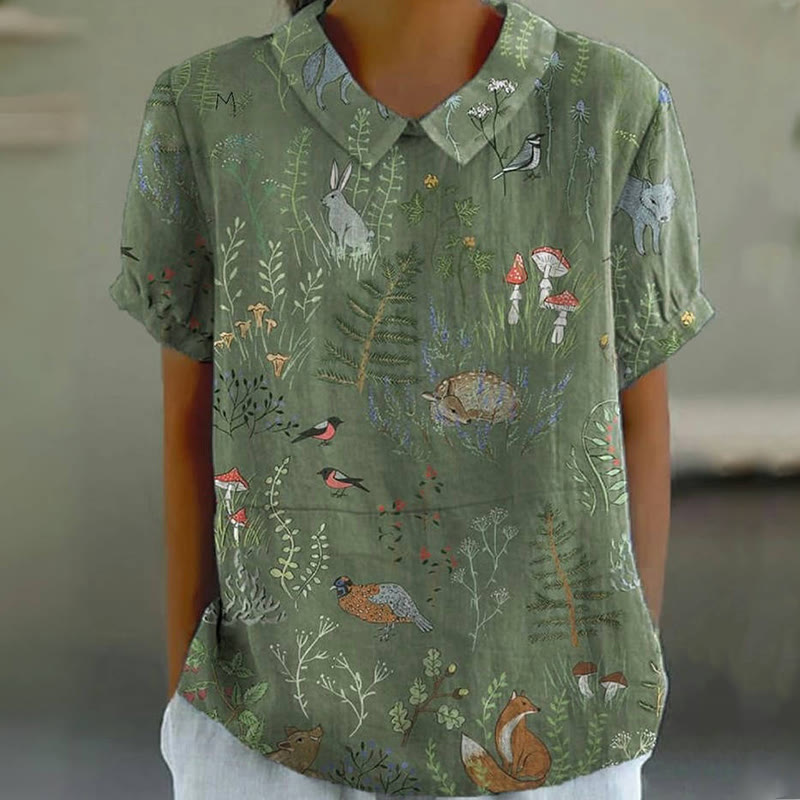 Woodland And Animal Pattern Printed Women's Casual Cotton And Linen Shirt