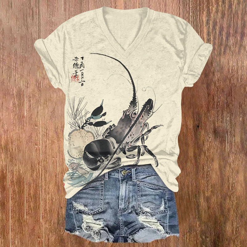 Vintage Ink Watercolor Shrimp Print Short Sleeved V-neck T-shirt