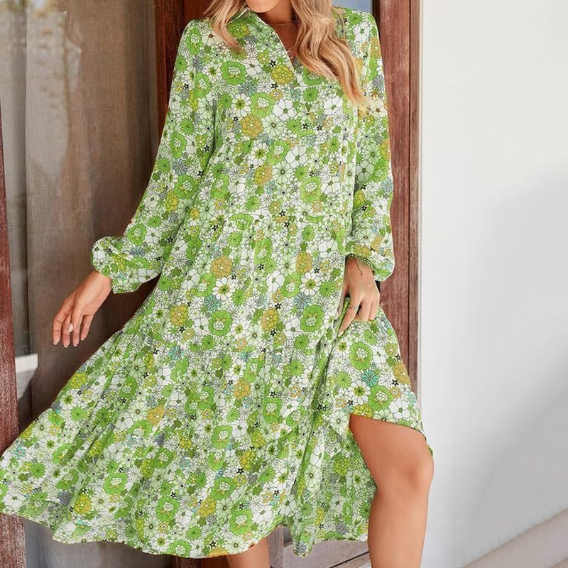 Boho Wildflower Print Shirt V-neck Lantern Sleeves Mid Dress