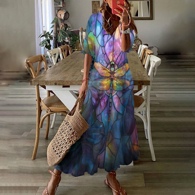 Women's Oil Painting Fantasy Dragonfly Art Print Short Sleeve V-neck Maxi Dress